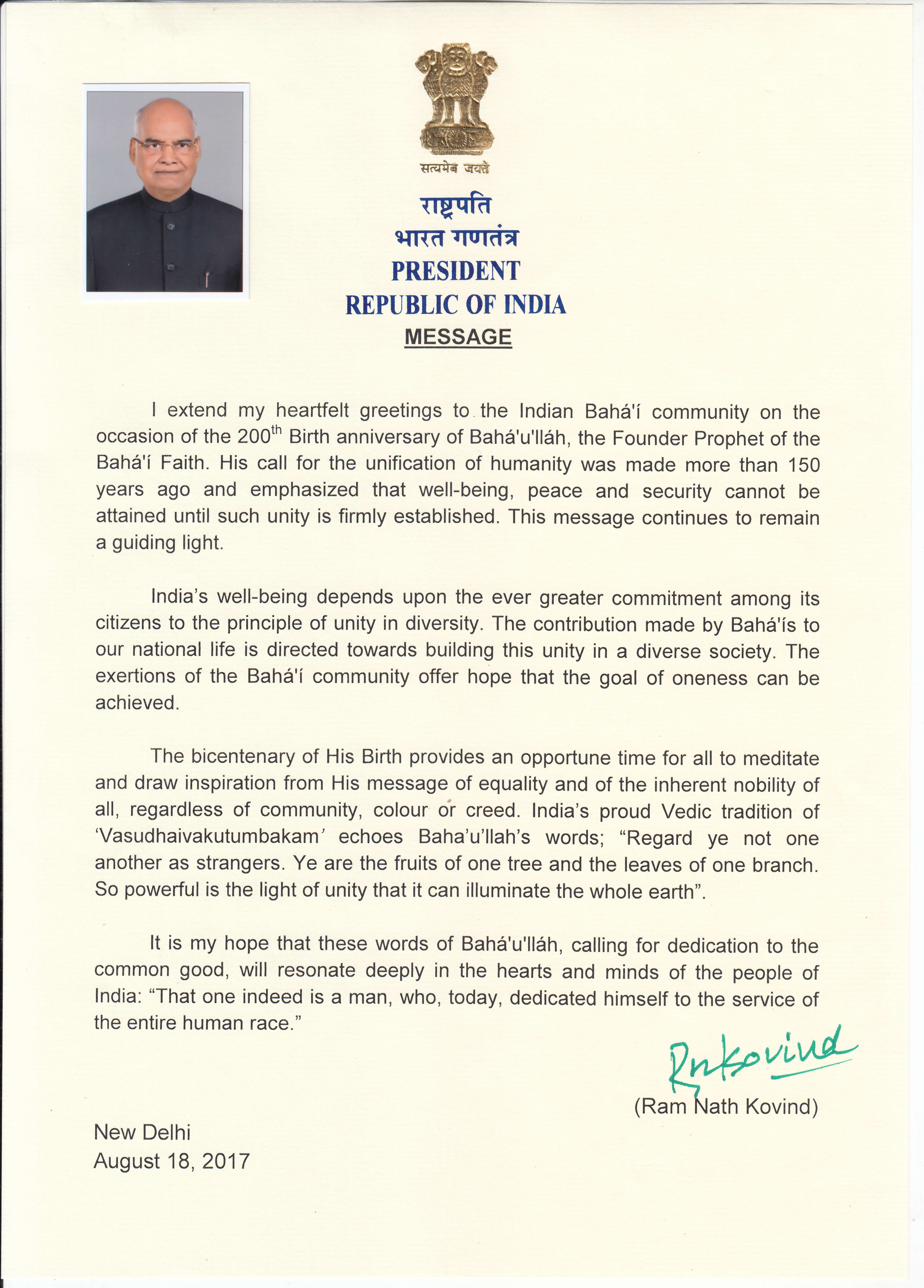 Após a homenagem do Presidente da Índia no passado mês de Abril, agora foram o primeiro-ministro Narendra Modi e o recém-eleito presidente, Ram Nath Kovind, que divulgaram mensagens sobre o bicentenário do nascimento de Bahá’u’lláh. "A Fé Bahá’í dá ao mundo uma visão de fraternidade universal", escreveu o primeiro-ministro Modi na sua carta à comunidade Bahá’í da Índia. "Transmite-nos o amor e o respeito, e pretendem tornar o mundo um lugar belo que celebra a harmonia e a paz" Falando sobre a Comunidade Bahá'í na Índia, Modi escreveu: "Desde a revelação do Profeta Bahá’u’lláh, a Fé Bahá’í encontrou aceitação sincera na Índia, onde, desde então, uma das suas comunidades mais dinâmicas floresceu". E acrescentou ainda que instituições como o Templo Bahá’í - conhecido como o Templo do Lótus - "simbolizam" o "espírito de comunhão e fraternidade universais". O presidente Ram Nath Kovind, que tomou posse no final de Julho deste ano, escreveu a sua própria mensagem aos Bahá’ís, declarando: "o bem-estar da Índia depende do compromisso cada vez maior dos seus cidadãos com o princípio da unidade na diversidade... Os esforços da comunidade Bahá’í oferecem esperança de que o objectivo da unidade possa ser alcançado". Outras entidades oficiais da Índia - incluindo o ex-presidente, o vice-presidente, altos membros do governo nacional e o ministro-chefe de um dos estados da Índia e vários funcionários locais - também divulgaram declarações em homenagem a propósito do bicentenário.