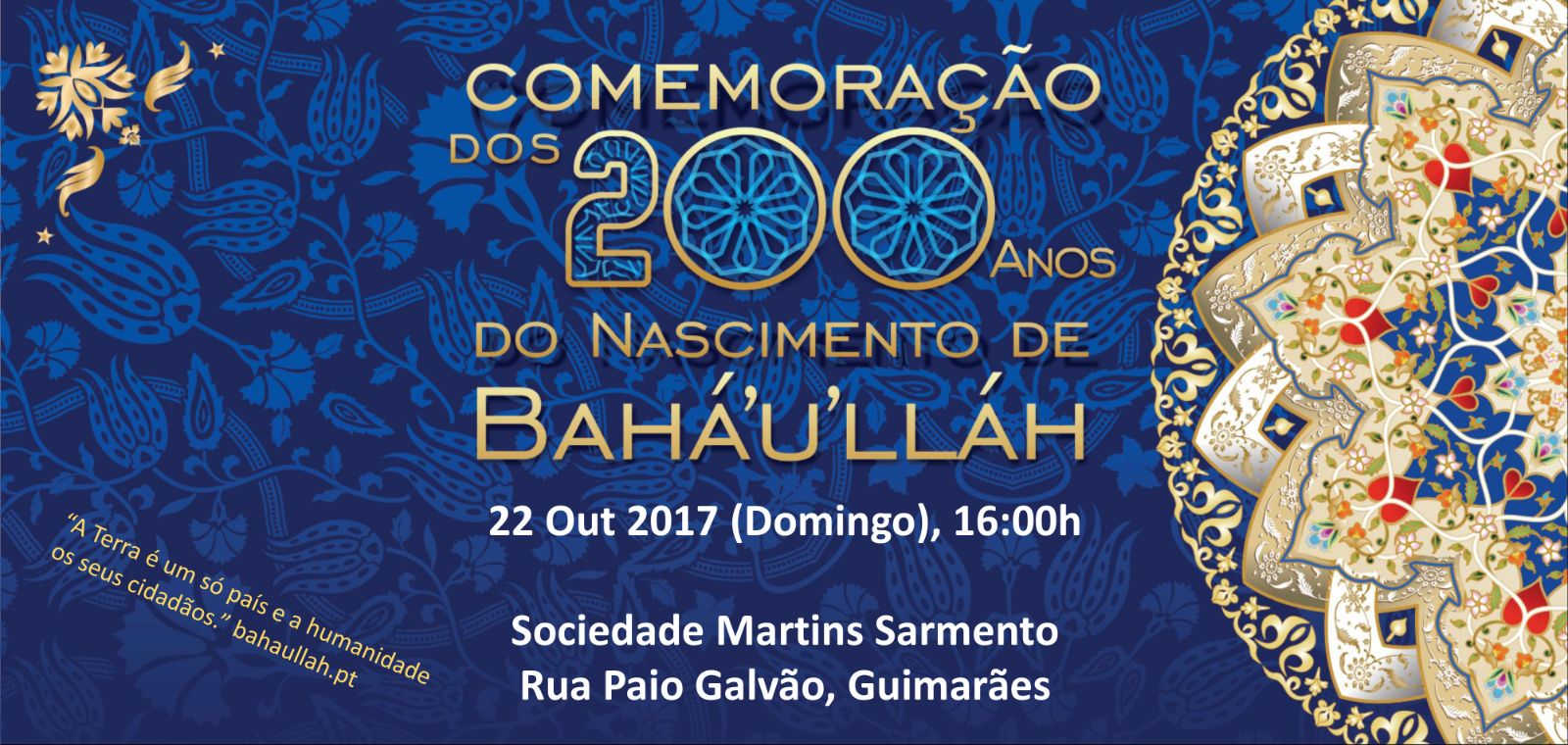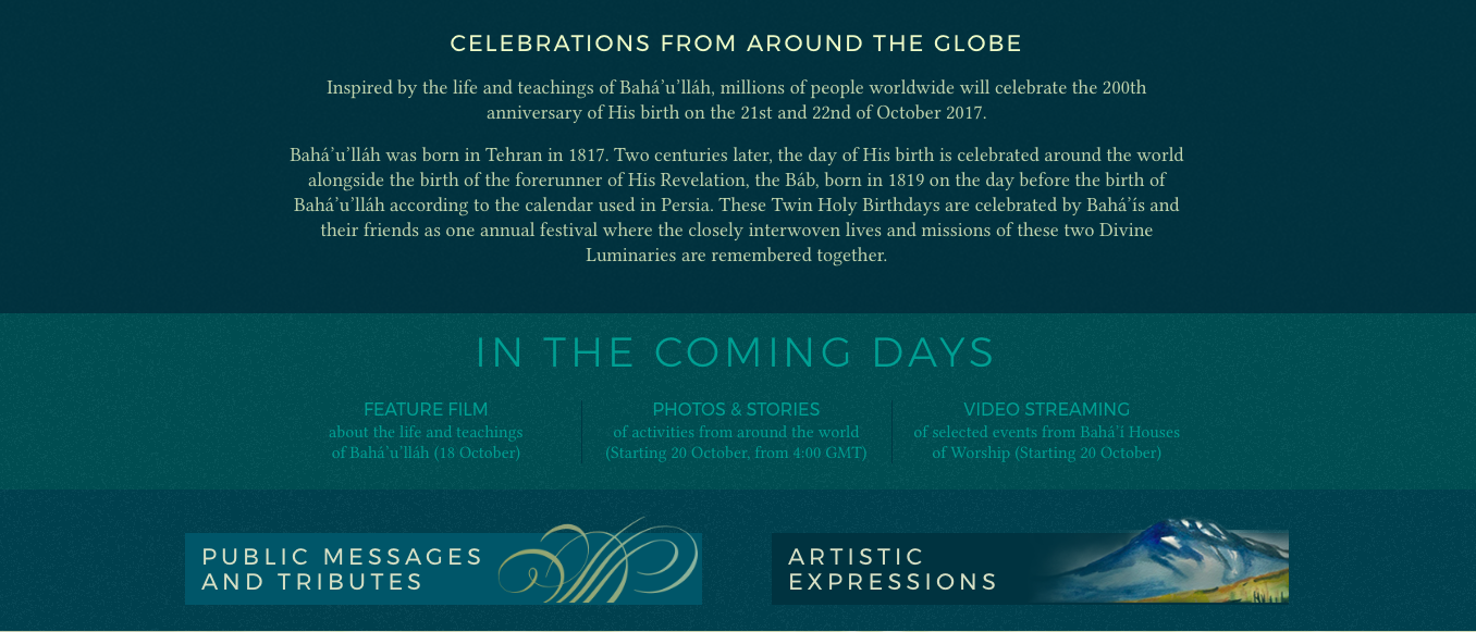 O ano de 2017 marca o bicentenário do nascimento de Bahá’u’lláh, o fundador da mais recente religião mundial – a Fé Bahá’í. Milhões de pessoas, de milhares de comunidades em todos os continentes, passaram meses a preparar-se para celebrar esta data histórica, bem como a Sua Mensagem de paz e amor – “A terra é um só país e a humanidade os seus cidadãos”.