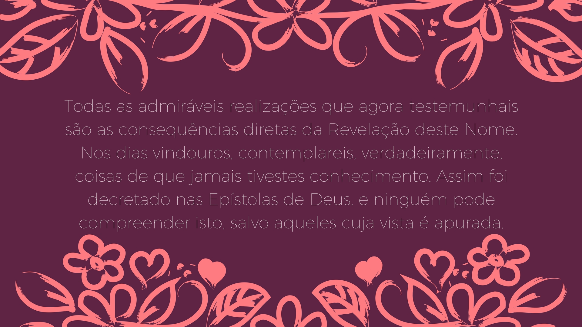 Nesta noite soprou a fragrância da proximidade, abriram-se de par-em-par os portais da reunião do fim dos dias e todas as coisas criadas foram impelidas a exclamar: “O Reino é de Deus, o Senhor de todos os nomes, Quem surgiu com soberania mundial!” Nesta noite, a Assembleia nas alturas celebrou o louvor do seu Senhor, o Excelso, o Mais Glorioso, e as realidades dos nomes divinos enalteceram Aquele Que é o Rei do princípio e do fim nesta Revelação - uma Revelação através de cuja potência as montanhas se precipitaram em direção Àquele Que é o Todo-Suficiente, o Altíssimo, e os corações se volveram para o semblante do seu Bem-Amado, e as folhas se agitaram com as brisas do anelo, e as árvores ergueram as suas vozes em resposta rejubilante ao apelo d’Aquele Que é o Irrestrito, e a terra inteira tremeu de ânsia no seu desejo de conseguir reunir-se com o Rei Eterno e todas as coisas se renovaram através daquela Palavra oculta que surgiu neste poderoso Nome.